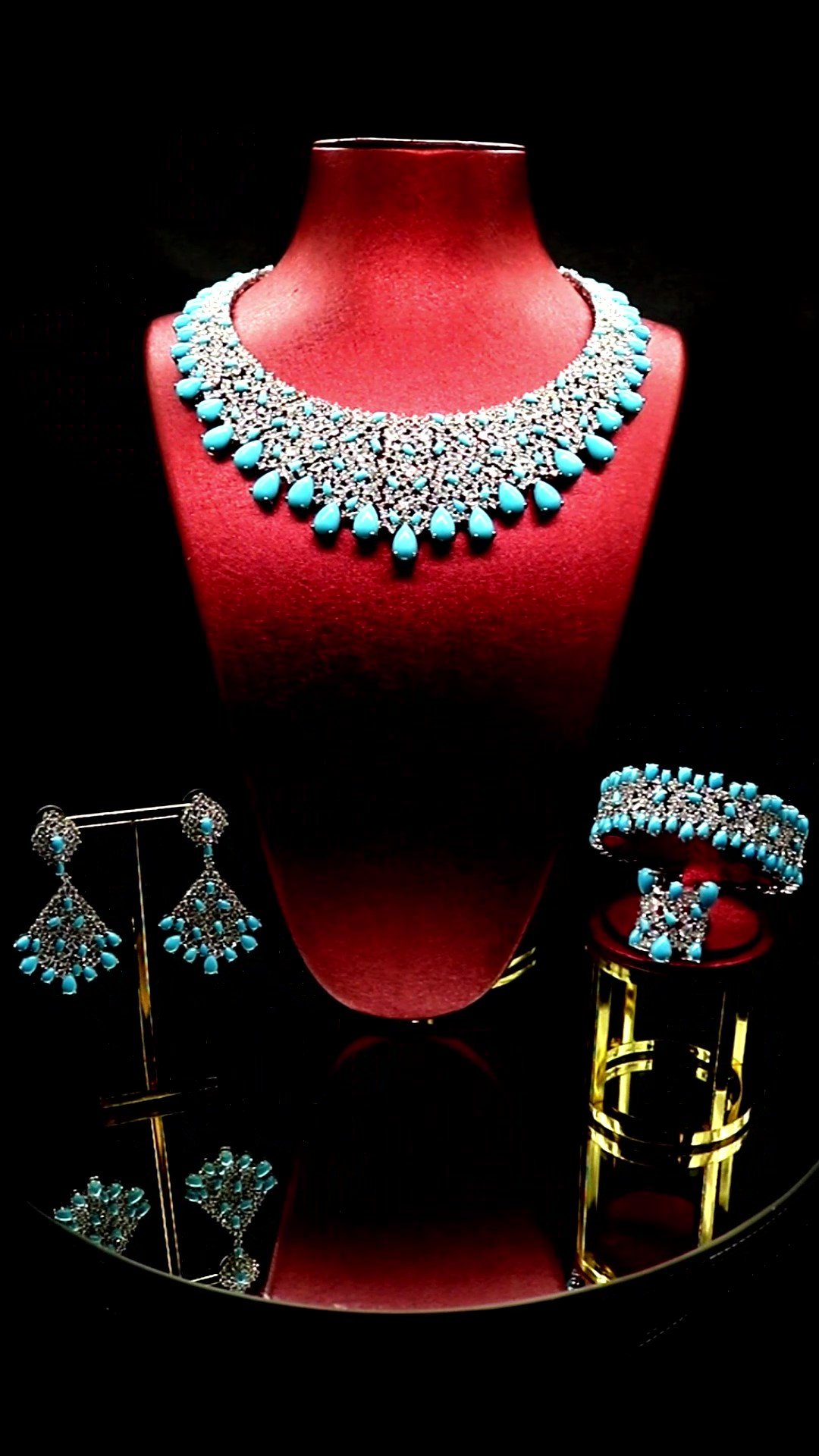 Zirkonyumdan yapılmış, yüksek stabiliteye sahip rodyum kaplamalı ve yüksek kaliteli Avusturya Swarovski taşlarıyla süslenmiş set.